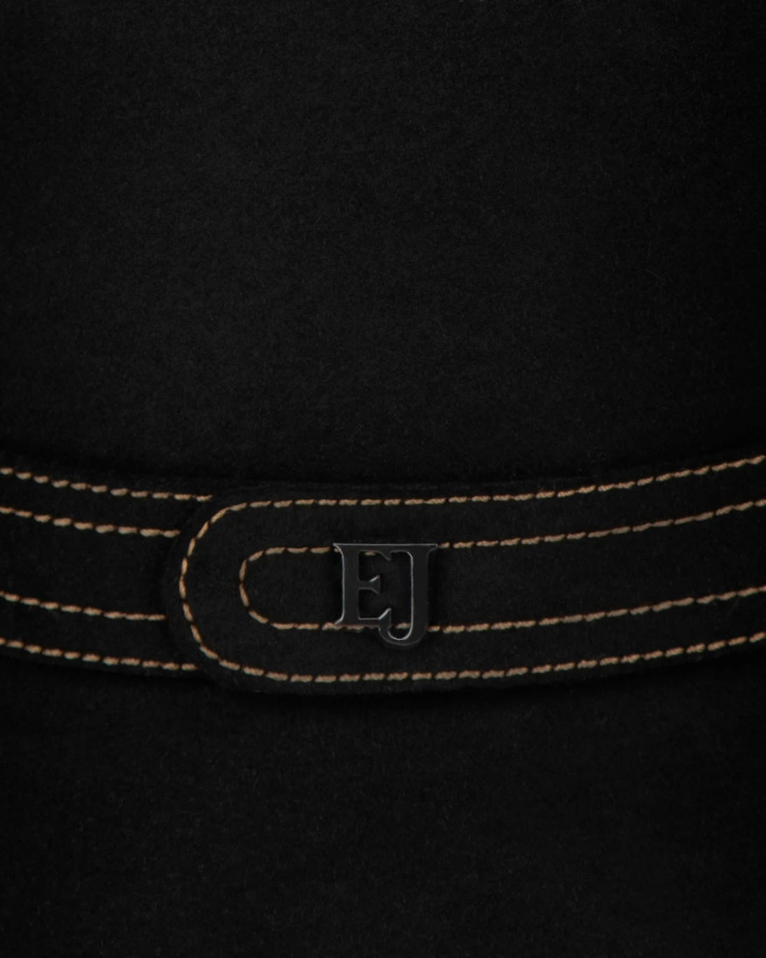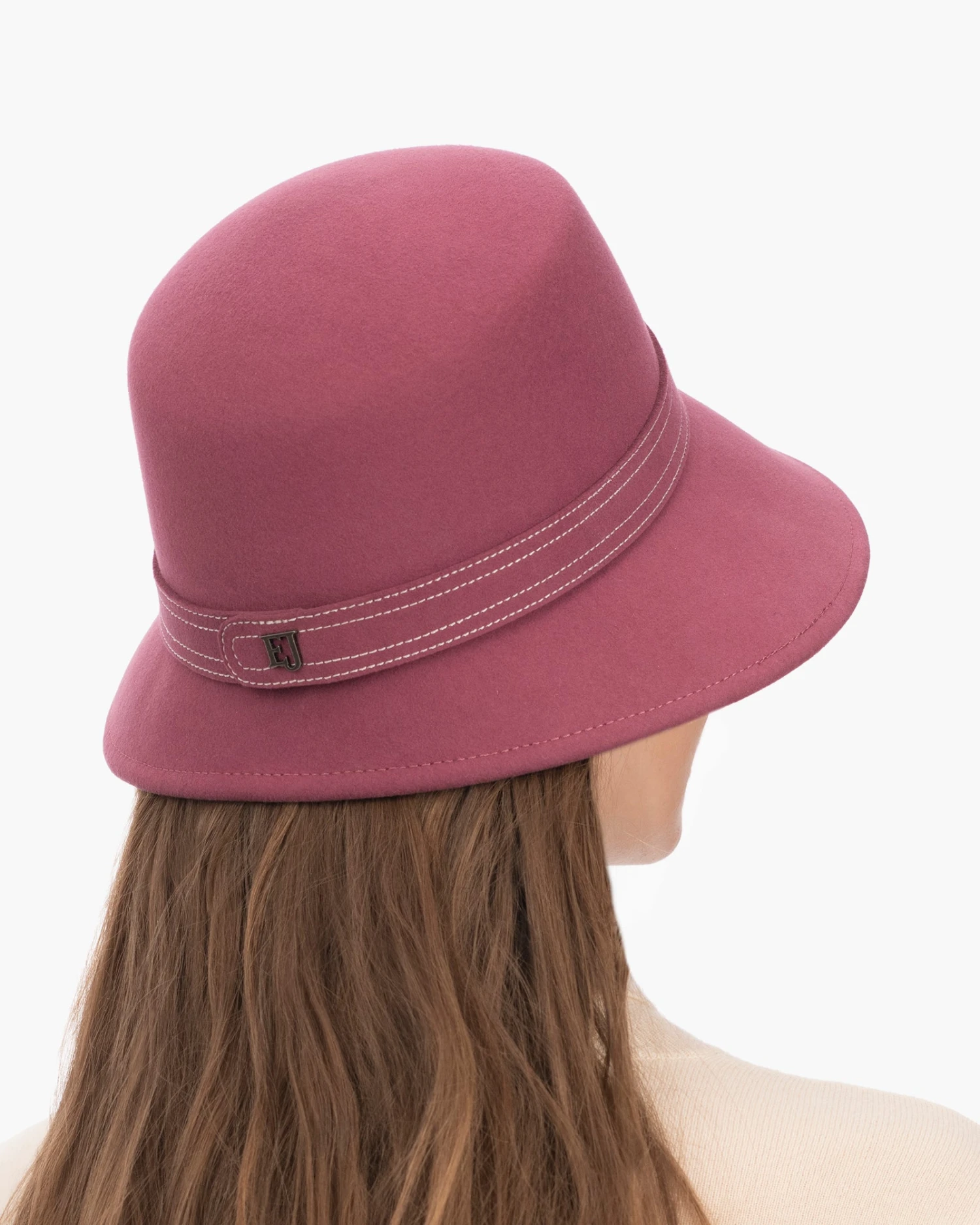 A fashionable women’s cloche hat is hand-blocked of the finest superfelt, and then trimmed with a contrast stitch matching band of the same. The ultra sleek silhouette features a rakishly downturned brim, bringing focus to the eyes while framing the face beautifully.