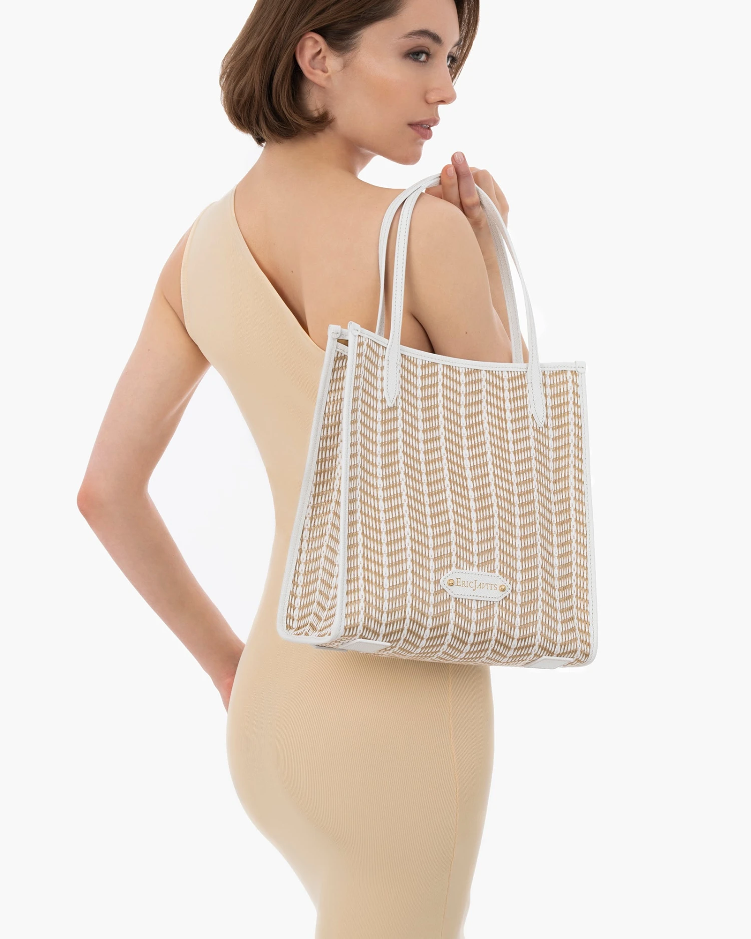 A women’s mid-size shoulder tote of raffia straw for sale online with zip top closure and outer pocket on reverse is a minimalist’s delight!