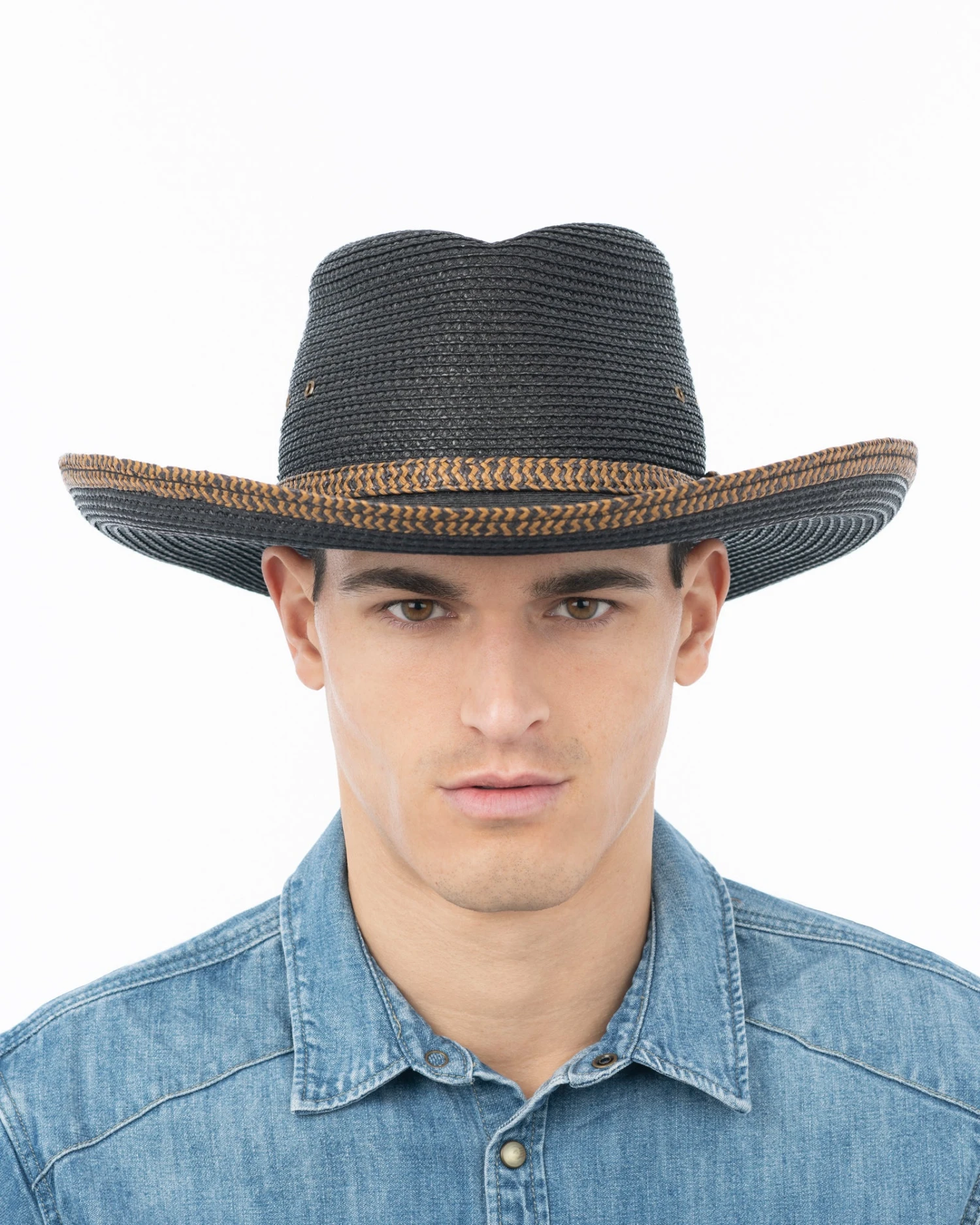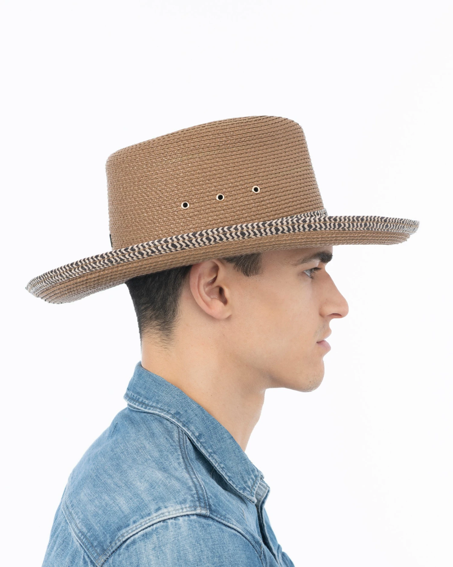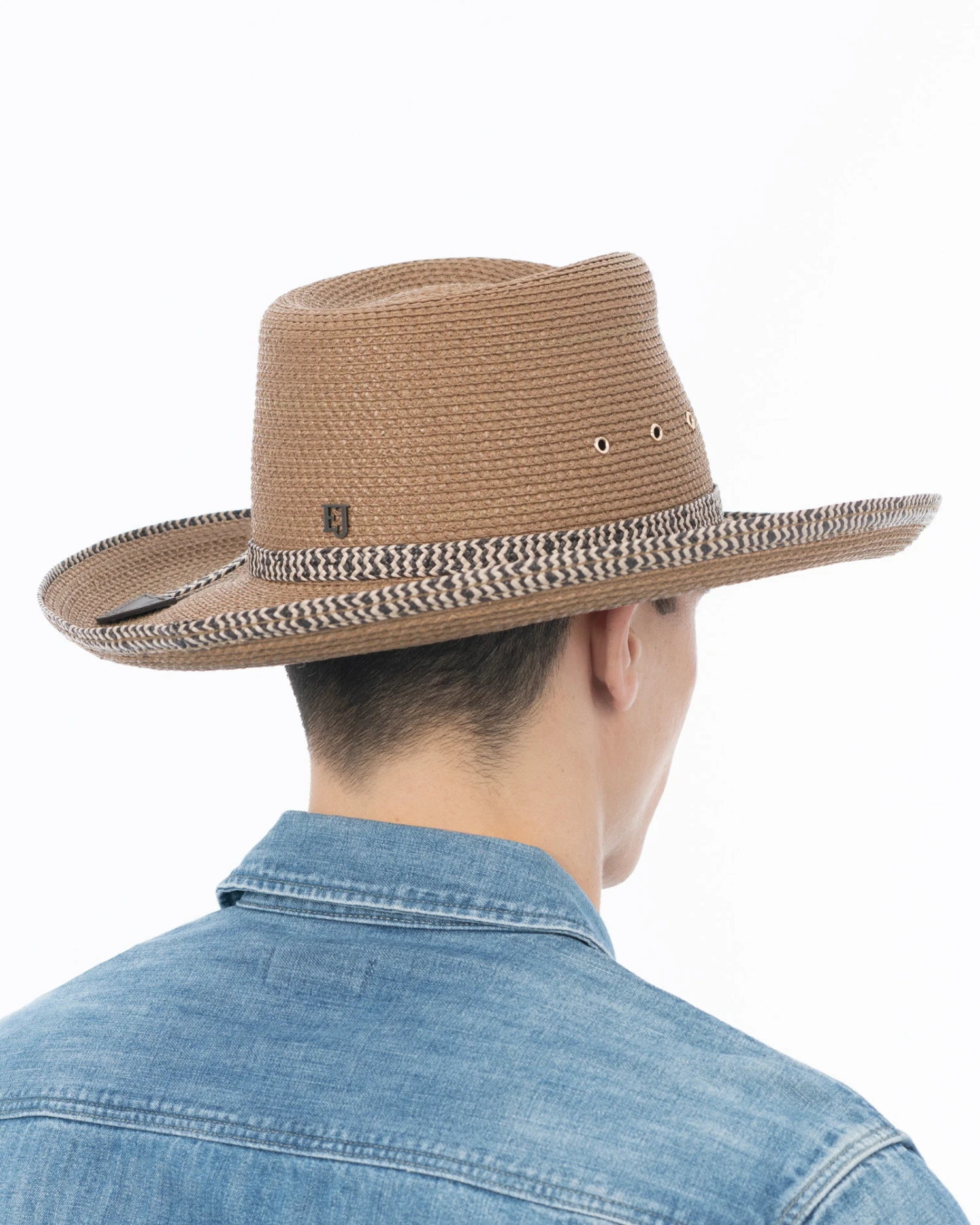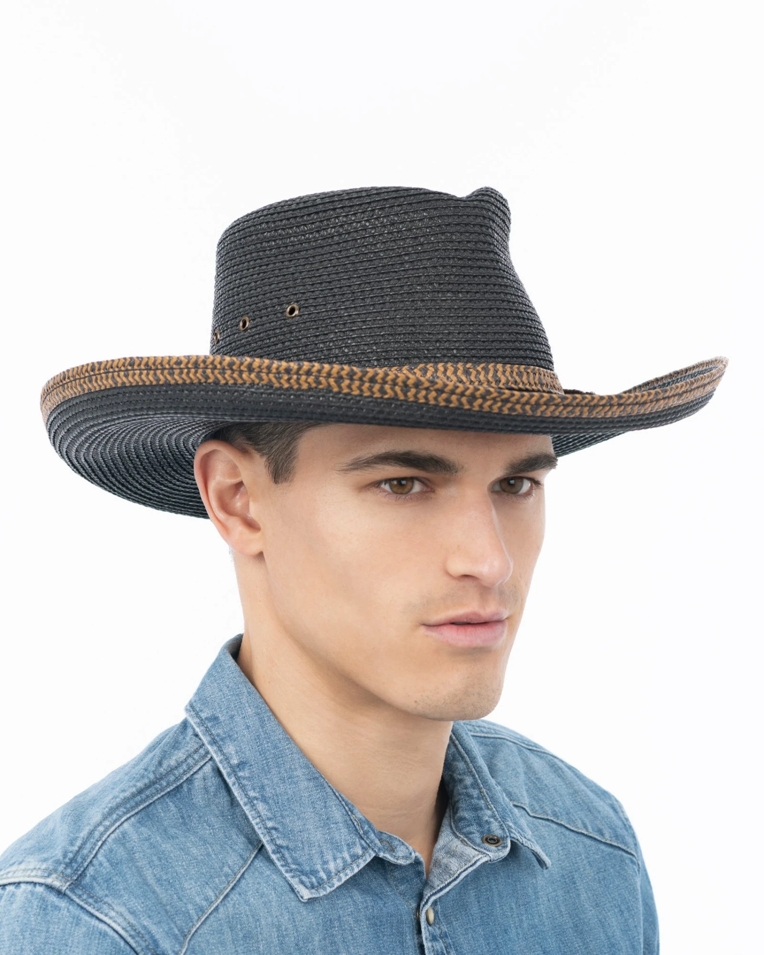 Western hat connoisseurs, for whom a hat is a badge of distinction, will recognize that, ”Final Duel” is for a dude with serious style. The design’s unique visual feature is the contrast weave trim at the base of crown as well as along the edge of the brim. Antique brass eyelets on either side of the crown are for maximum airflow.