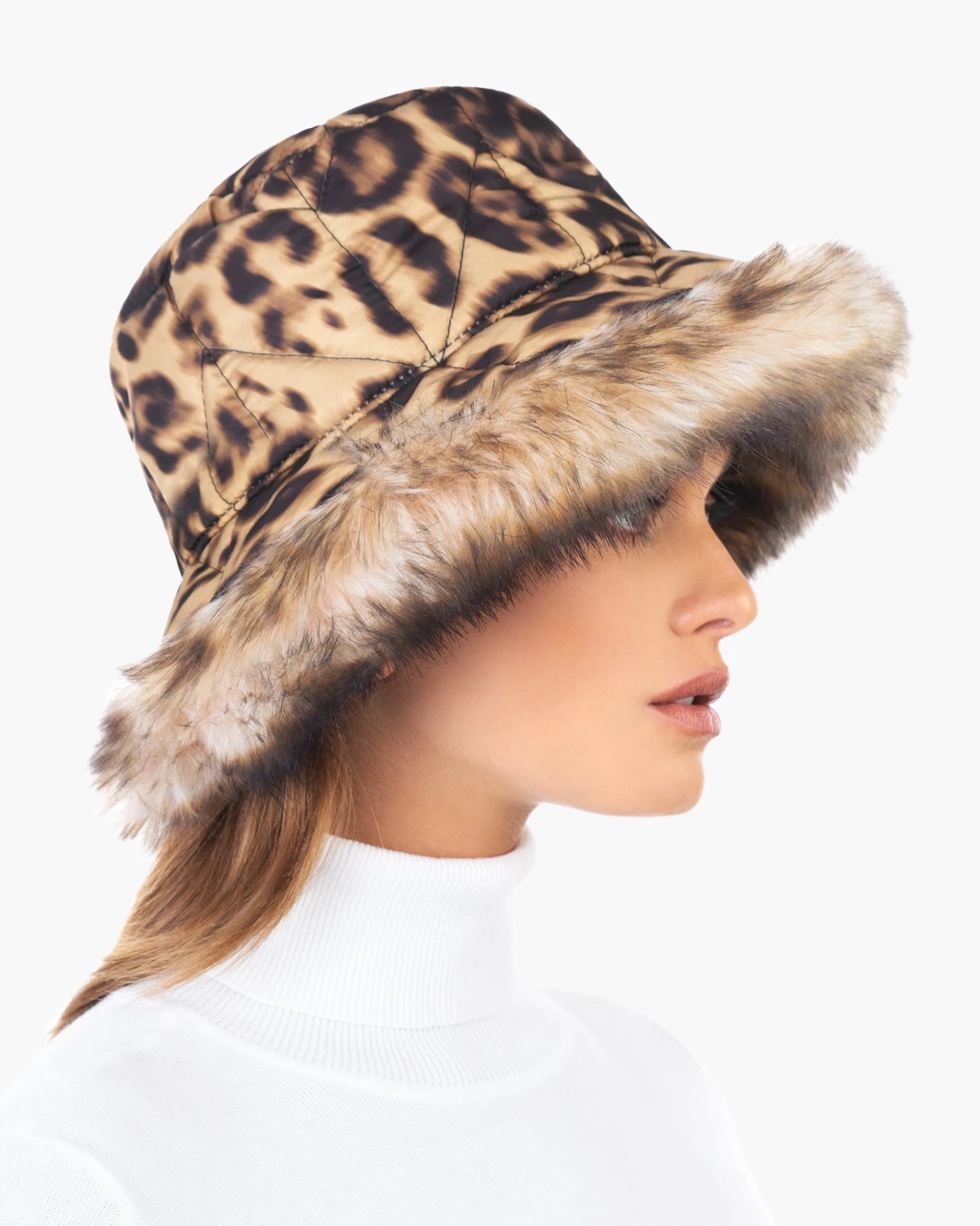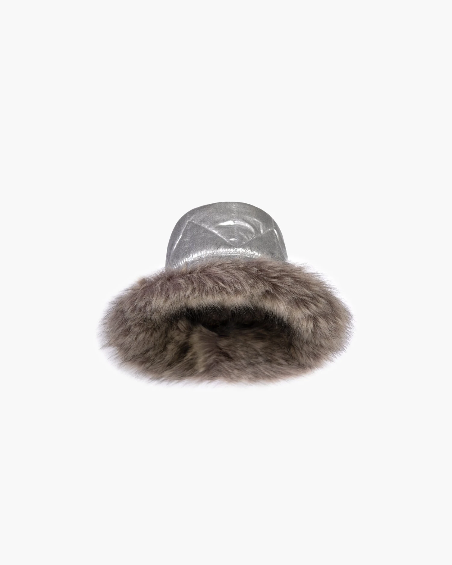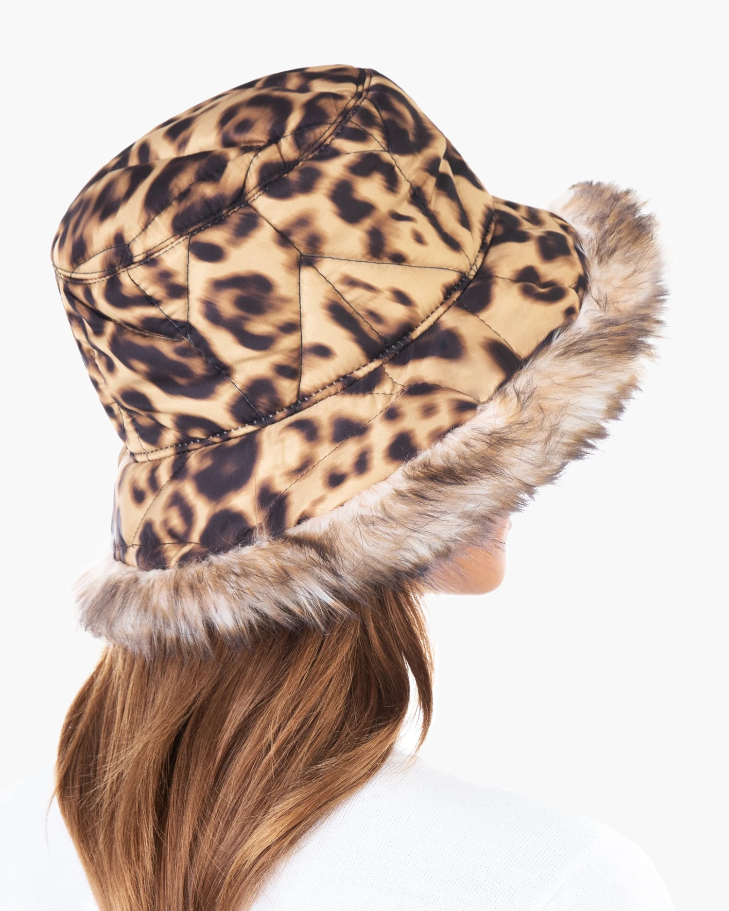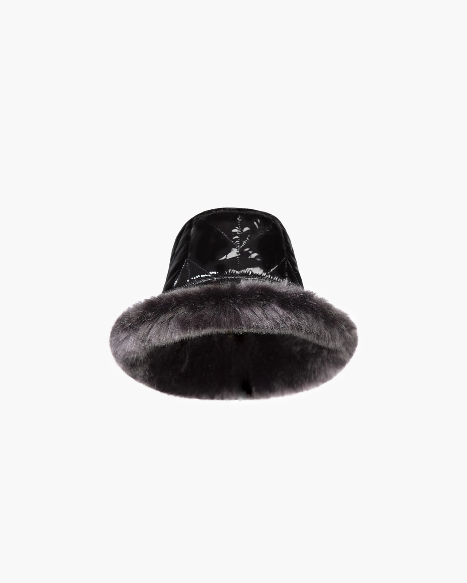 Cold weather puffer bucket of quilted nylon is cozy and crushable, lined with sumptuous faux fur on the edge of the brim. The elasticized inner band fits most. Water-repellent and packable.