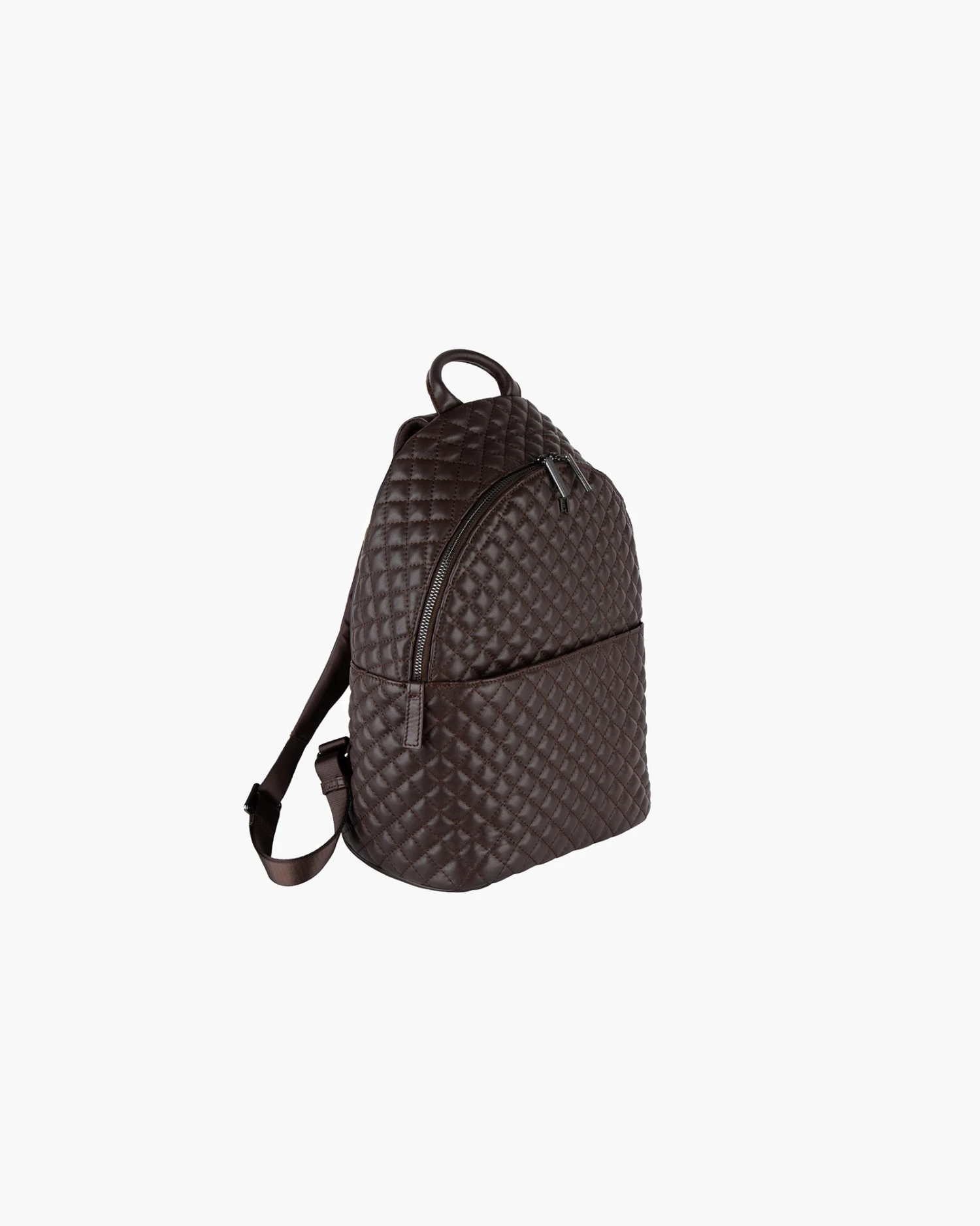 The mid-size dome top quilted leather backpack is unisex and features a two-way top entry zipper, top handle, adjustable padded leather straps, and roomy outer front zip compartment. This backpack is comfortable, lightweight and user-friendly of the softest scratch-proof leather. Padding is sufficient to not feel the bag’s contents when you have it on your back. Hardware is minimal in a shiny gunmetal finish.