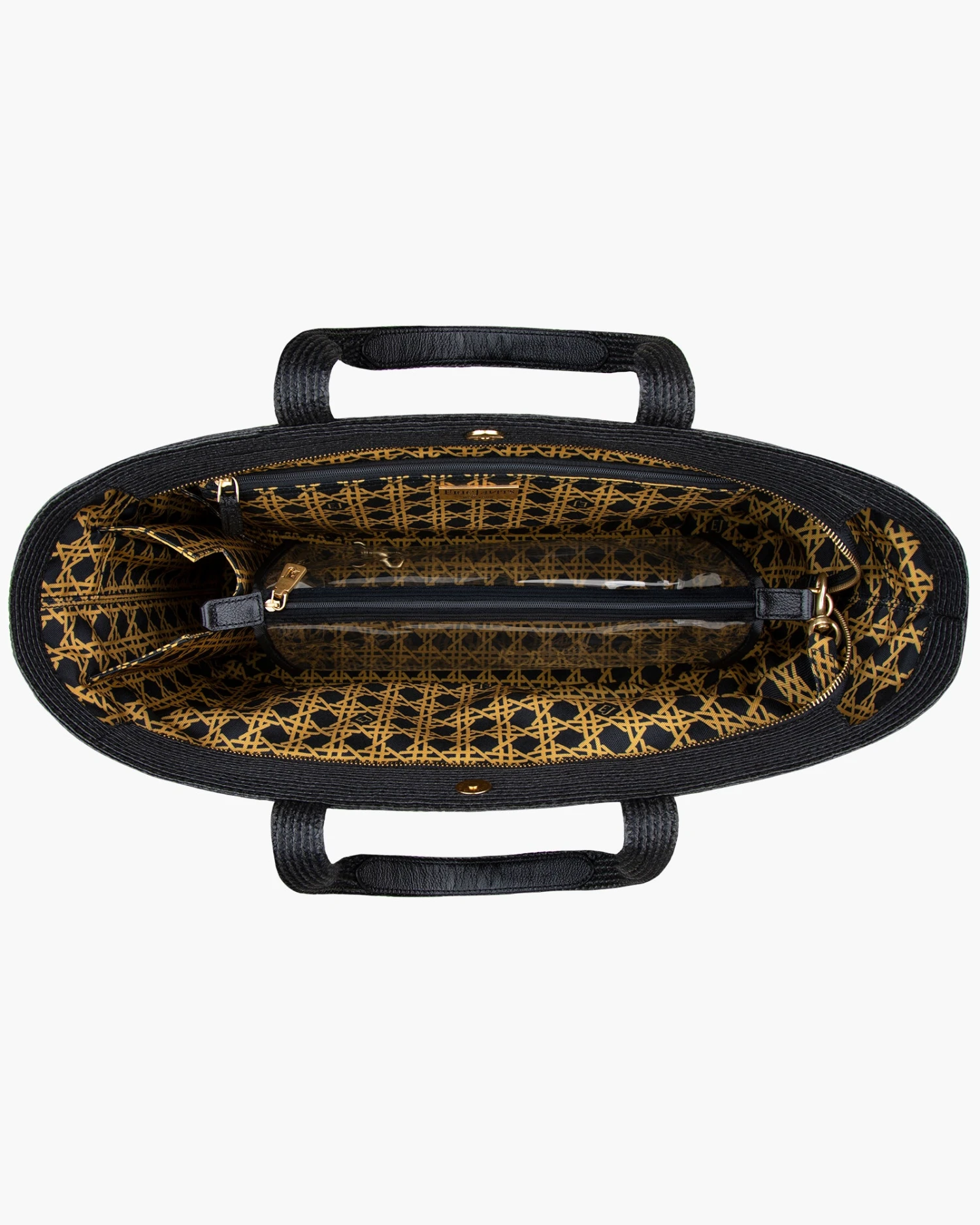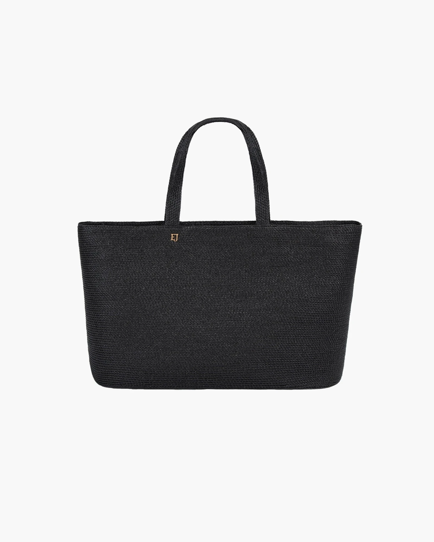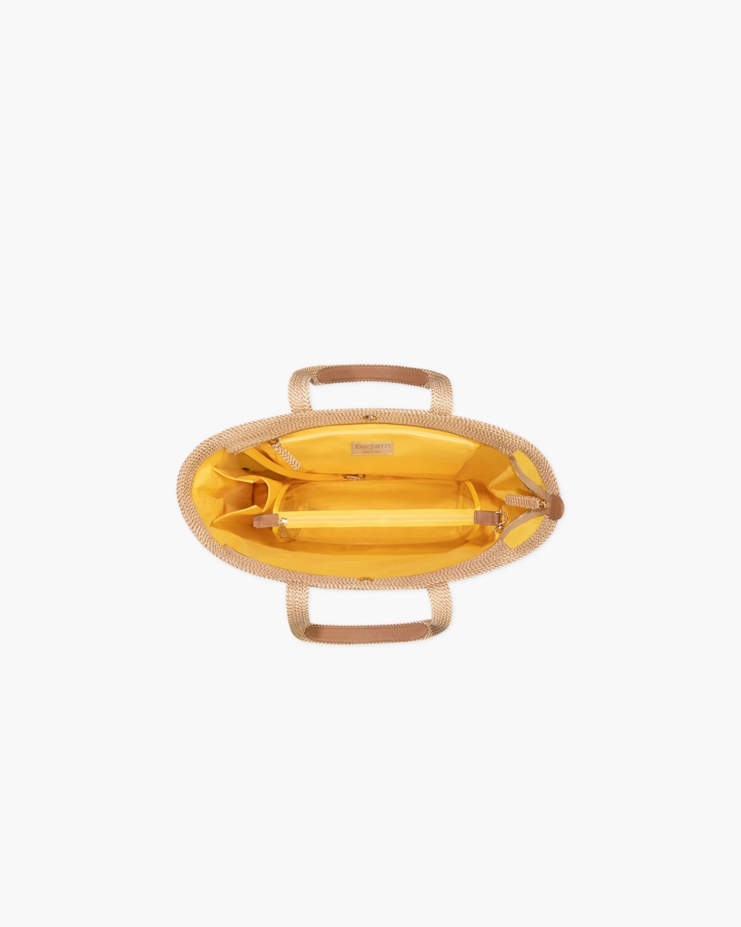 A roomy, multi-use east-west tote that is useful for the town during the week, weekends in the country, travel carry-on or going to the beach. The silhouette is carefully proportioned to maximize storage, but not overwhelm if you happen to be petite. Sinclair has two closure options, a zip-top as well as a magnetic snap. Other features include self-handles, leather trim, and protective bottom feet. Inside: water-repellent canvas lining, large sidewall zipper compartment, water bottle holder, key clip holder, and clear vinyl wet swimsuit case (also great for greasy lotions,) that clips out. Squishee is a man-made fiber that resembles natural raffia but is actually more durable, flexible, and lightweight.