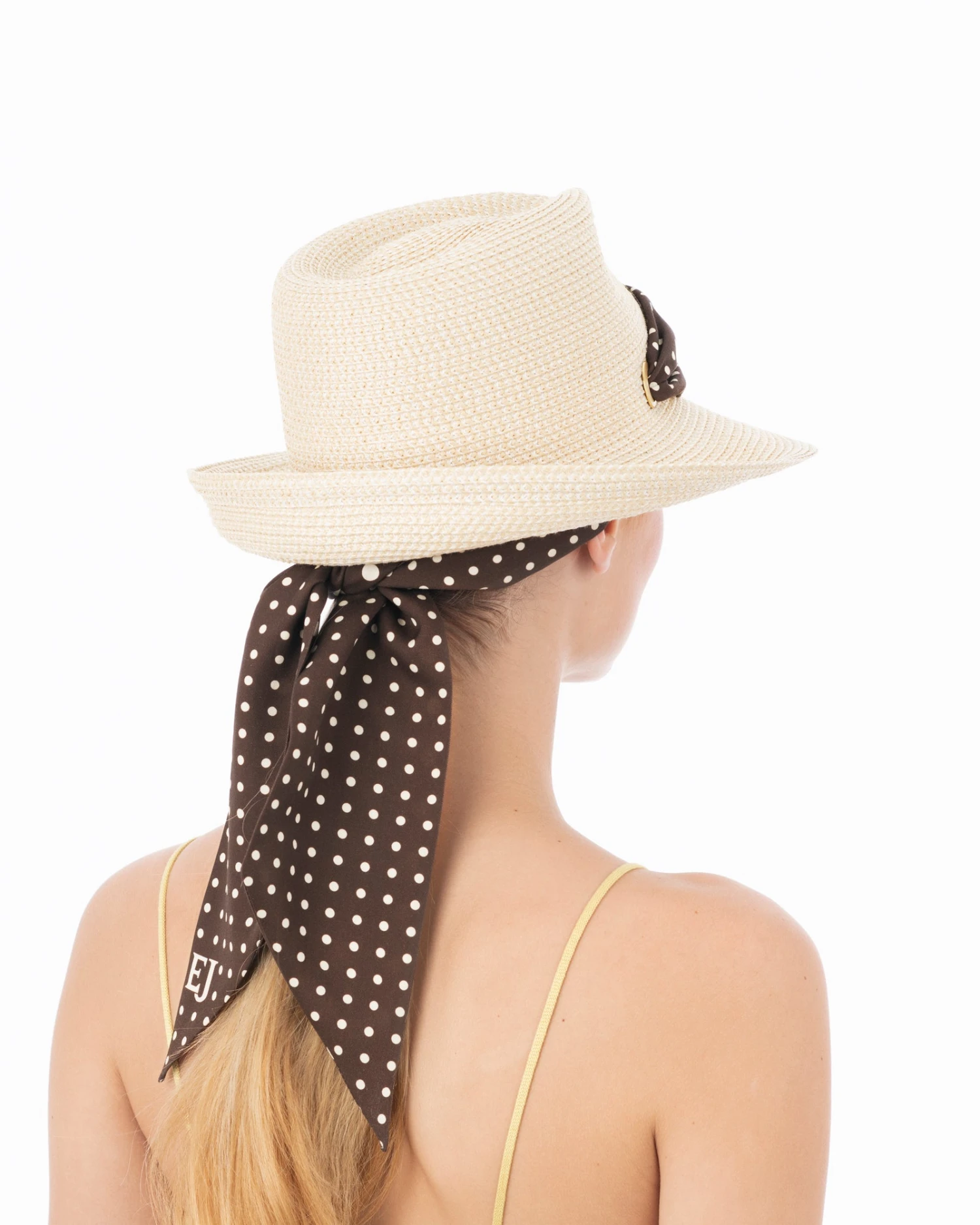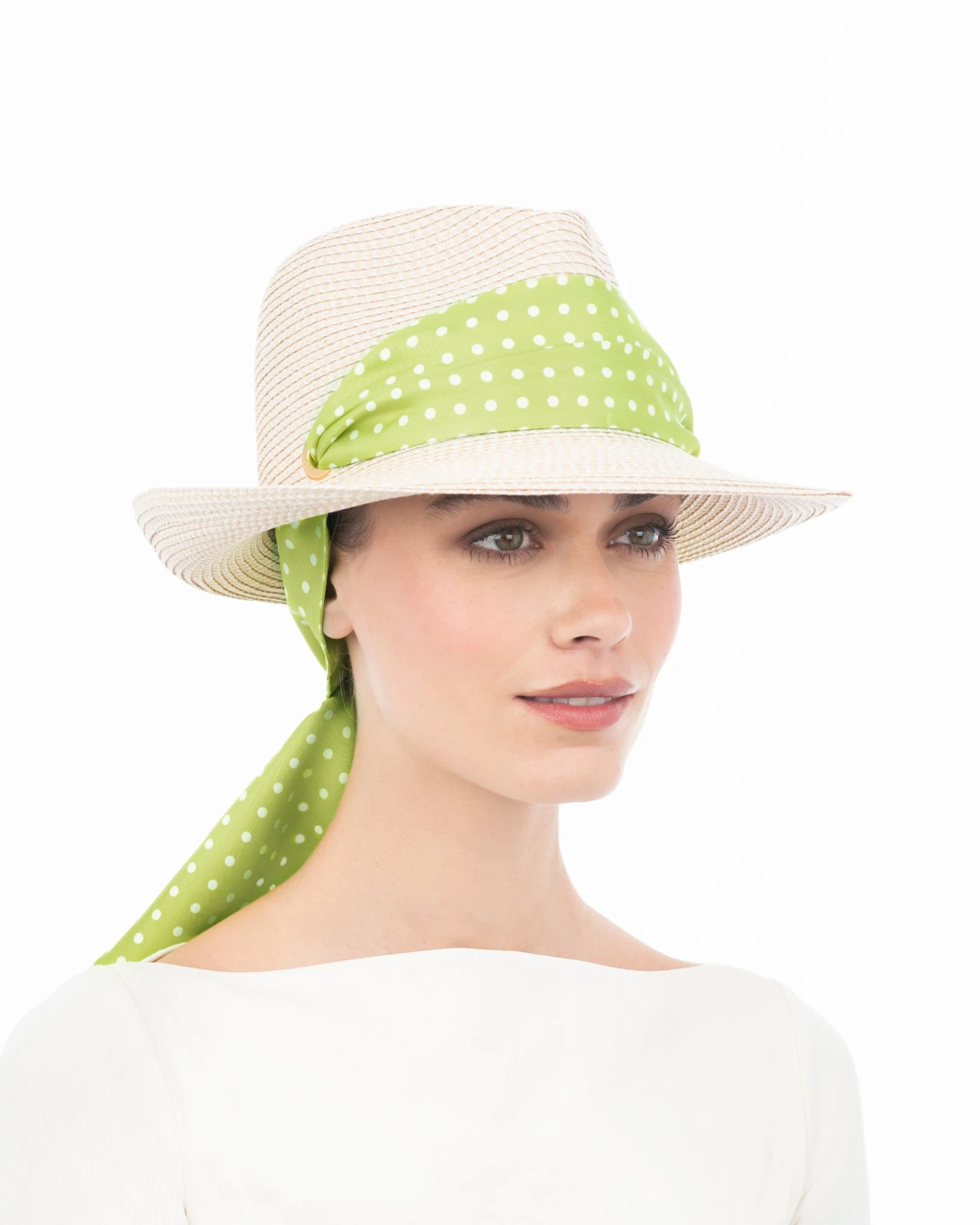 A fedora sun hat of our patented Squishee® straw with a twilly scarf tie, which secures it to the head. The scarf is removable for cleaning purposes.
